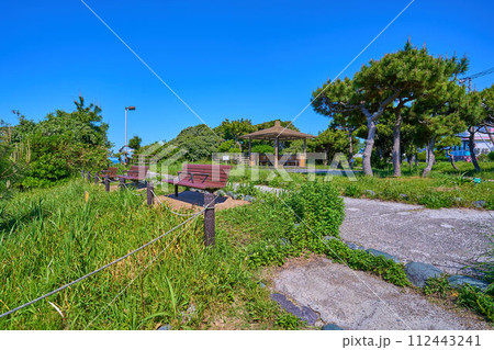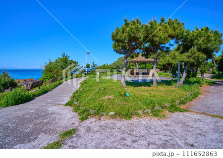 春の神奈川県横須賀市秋谷の立石公園の東屋とベンチ