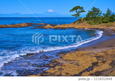 快晴の神奈川県横須賀市秋谷の立石公園の梵天の鼻付近から富士山と相模湾
