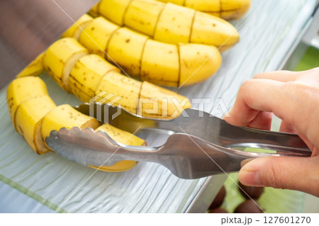 ビュッフェにあるバナナの写真。ビュッフェのイメージ。
