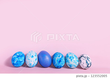 Decorated blue easter eggs on a pink background. Minimal holiday concept. Happy easter background. Creative painting of eggs at home, the idea of simple drawings for coloring
