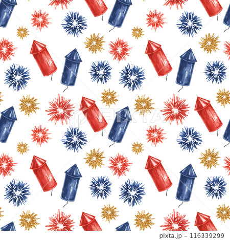 Fourth of July seamless pattern. Red, Blue firecrackers and fireworks bursts. Independence day holiday background. Hand drawn watercolor 4th of July clipart for wrapping paper, gifts, textile, napkins