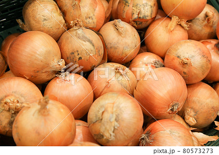 スーパーの棚に並ぶ新鮮な玉ねぎ