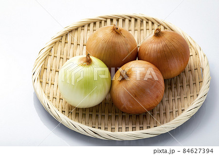 白バックでざるに乗せた玉ねぎ