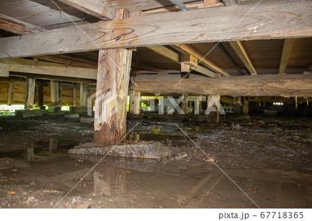 シロアリ被害の床下 大雨の床下浸水被害の古い日本家屋
