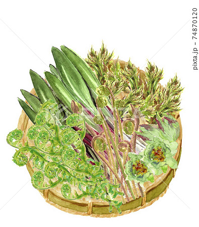 【水彩画】ザルにのせた春の山菜5種 植物 食材 素材 白バック PNG コピースペースあり