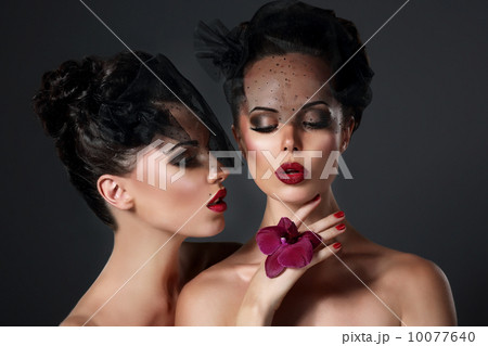 Glam. Affectionate Quaint Women in Voiles with Violet Flower. Retro Style