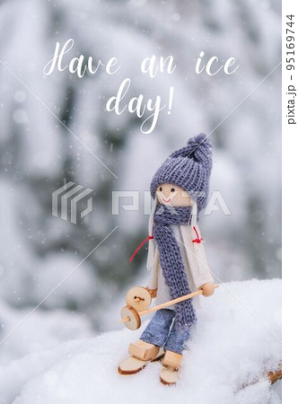 Have an ice day Inspiration joke quote phrase Angel gnome in scarf and knitted hat skiing on snowy fir branch Elf toy on skis in snowy landscape New year and Merry Christmas greeting card winter