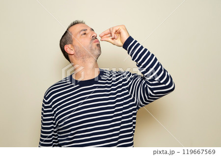 Bearded hispanic man in his 40s wearing a striped sweater, smacking lips and licking fingers after devouring a delicious treat, isolated over beige studio background