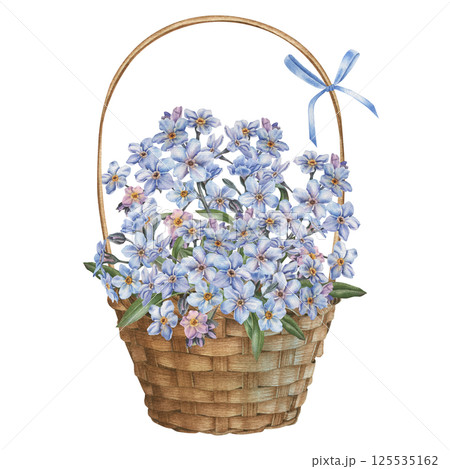 Wicker round basket with handle, bouquet of tiny blue flowers and bow. Hand drawn watercolor illustration of wooden container for rustic design on isolated background. Retro element for Easter decor.