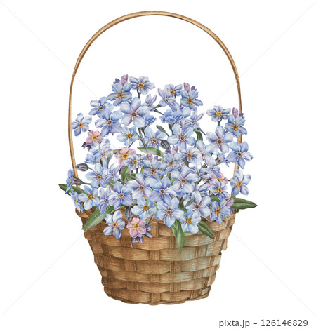Wicker round basket with handle and bouquet of tiny blue flowers. Hand drawn watercolor illustration of wooden container for rustic design on isolated background. Retro element for Easter decor.