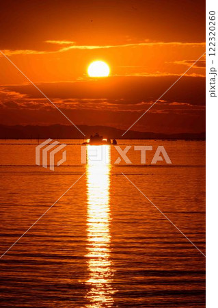 夕焼けを背景に風流島(たわれじま)光の道を渡る海鳥「枕草子や伊勢物語など平安時代の書物に登場」宇土市