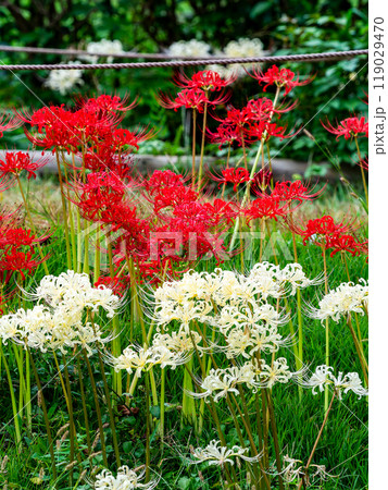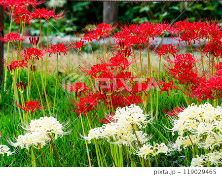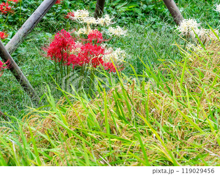 秋の風物詩 たわわに実った稲と畦道に咲いた紅白の美しい彼岸花