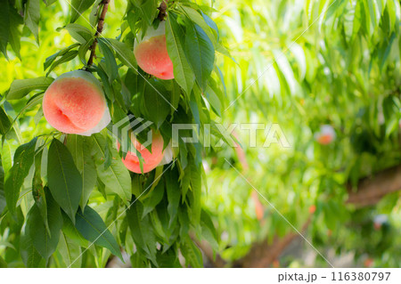 鮮やかに色づいた桃の実をぶら下げる桃の木