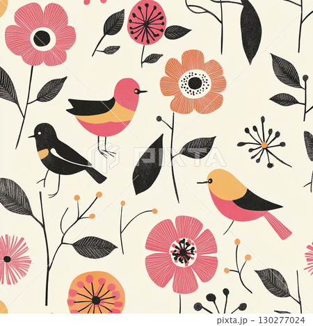 Stylized illustration of birds, flowers, and hearts in pink, orange, black, and white, featuring geometric shapes and whimsical decorative patterns.
