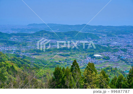 春の神奈川県秦野市の菜の花台展望台から南東側の眺望(秦野市名古木,権現山,弘法山など)