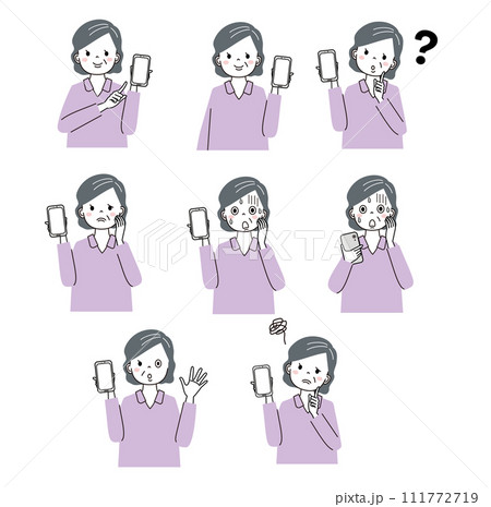 スマートフォンをもった高齢女性 いろんな表情のバリエーションセット
