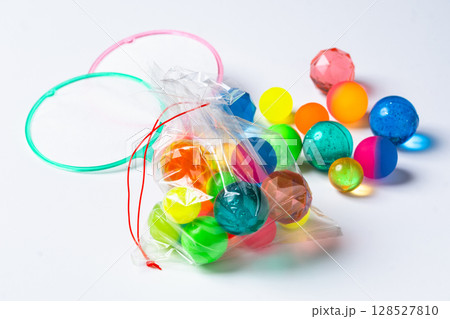 カップに入ったカラフルなスーパーボールとポイと海の生きもののおもちゃ