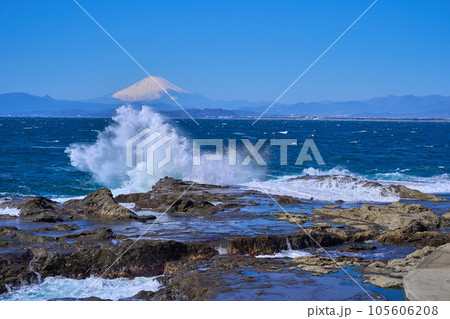 神奈川県藤沢市江の島の稚児ヶ淵から岩礁に打ち寄せる波と富士山を見る