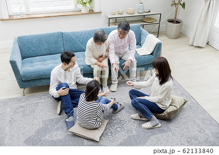 リビングでじゃんけんをする3世代家族 ファミリー 一家団欒イメージ