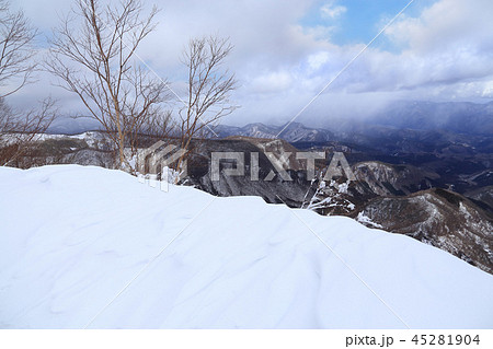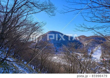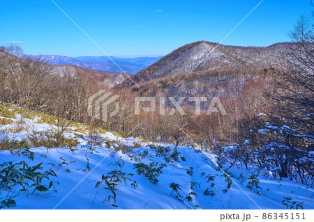 冬の群馬県赤城山の地蔵岳の八丁峠登山道の中腹から東側の長七郎山方面の眺望
