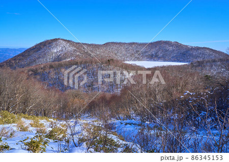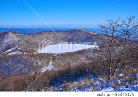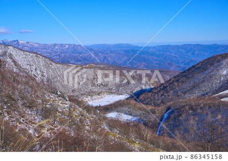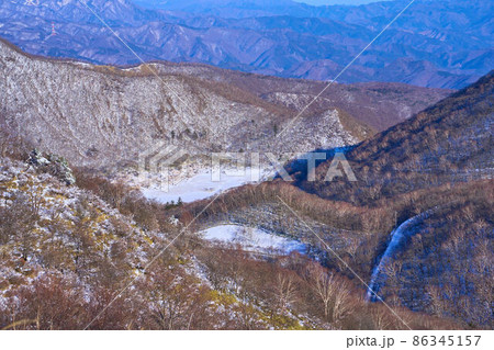 冬の群馬県赤城山の地蔵岳の山頂付近から覚満淵(かくまんぶち)方面