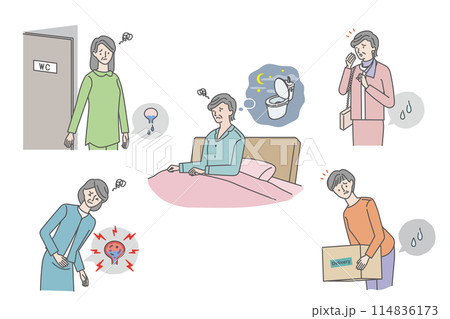シニア女性の尿トラブル(尿漏れ・残尿感・夜間頻尿・膀胱炎)イラストセット
