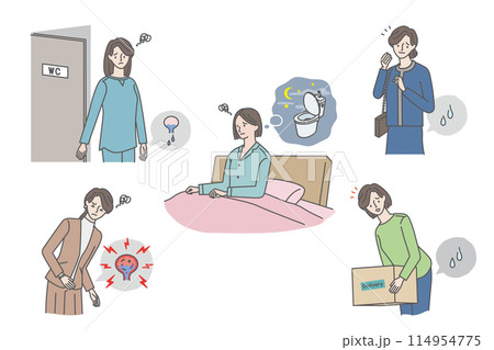 女性の尿トラブル(尿漏れ・残尿感・夜間頻尿・膀胱炎)イラストセット