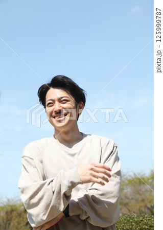 遠くを見る笑う若い男性ライフスタイルイメージ