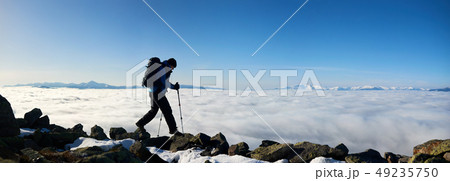 Tourist with backpack hiking on rocky mountain peak on background of foggy valley and blue sky at
