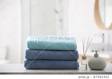 Stack of fresh towels, reed air freshener and soap dispenser on table in bathroom