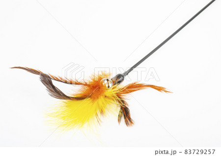 Pet toys. Stick with colored feathers for cat. Studio Photo.