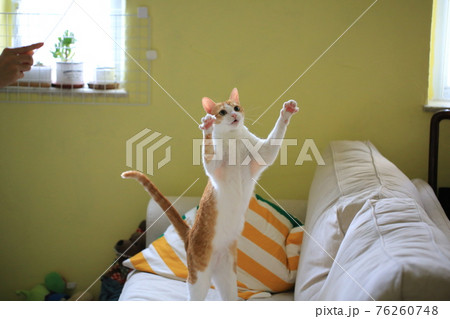 Close up of cute fluffy white cat playing with cat teaser. Mixed breed cat between Maine Coon and Scottish Fold.
