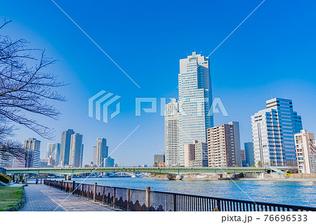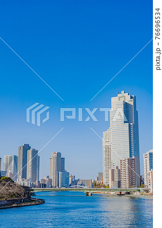 東京 早朝の青空が広がる隅田川と聖路加ガーデン