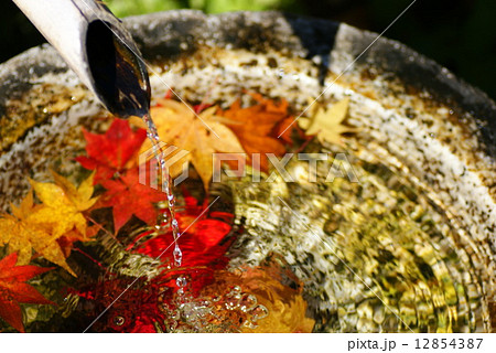 手水鉢ともみじ 秋イメージ 紅葉と水琴窟 秋の京都 紅葉とお寺 イメージ素材 背景素材