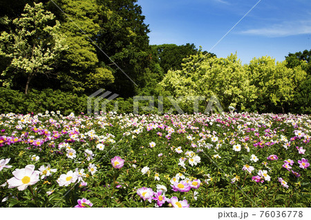 つくば牡丹園 ピンク色の芍薬の花が咲く風景