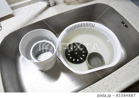 過炭酸ナトリウムを入れたお湯につけ置きした排水口トラップとゴミ受け