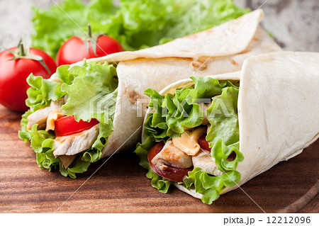 Tortilla wrap with fried chicken meat and vegetables isolated on white background