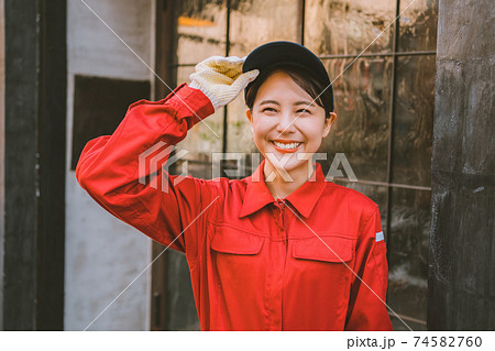 赤いつなぎを着た若い女性