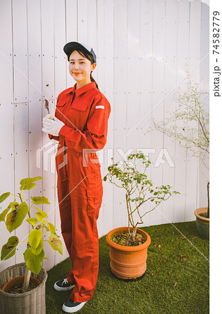 つなぎを着た若い女性