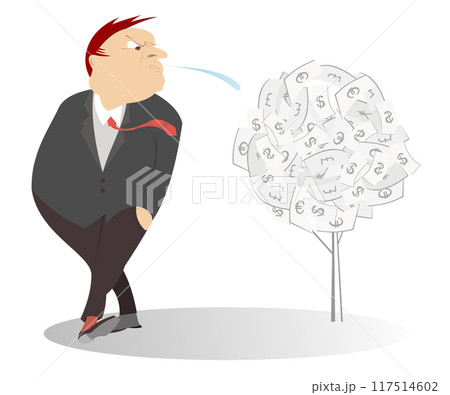 Money means nothing. Man spitting to the money tree. Concept. Cartoon man spitting to the money tree. Isolated on white background