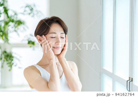 窓際で保湿を実感する若い女性