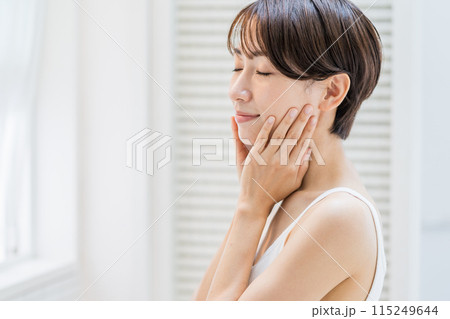 お肌の潤いを実感する女性。