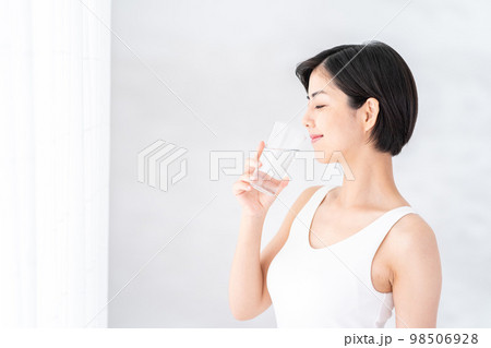 窓際で水を飲む女性。