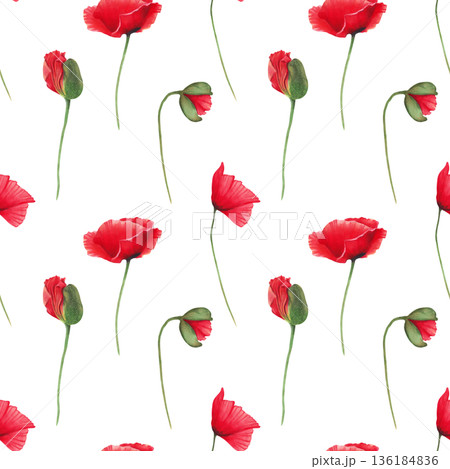 Seamless pattern of red poppies with buds on stems. Watercolor botanical illustration. Wild poppy festival. Hand-drawn isolated background. Remembrance, spring, and Labor Day. For fabric and textiles