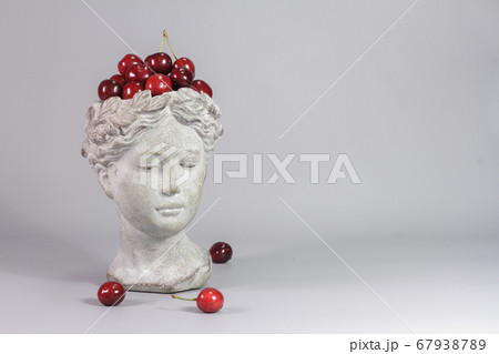 Stylish decoration made in shape of Greek goddess head full of red ripe cherries. Beautiful design elements. Gray background.