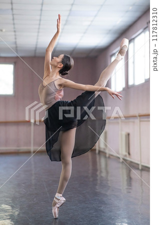 Graceful Asian ballerina in a beige bodysuit and black skirt is rehearsing in a dance class.