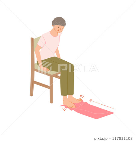 足の運動:シニア女性が椅子に座ってタオルギャザーをする