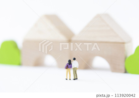 積み木の家と後ろ姿の男女のミニチュア