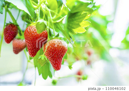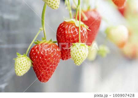 赤く実ったイチゴの果実 ハウスの苺狩り 宮城県山元町