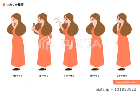 妊娠中の食べづわり、吐きづわり、眠りづわりなど妊婦さんのつわりの種類別シンプルセットイラスト